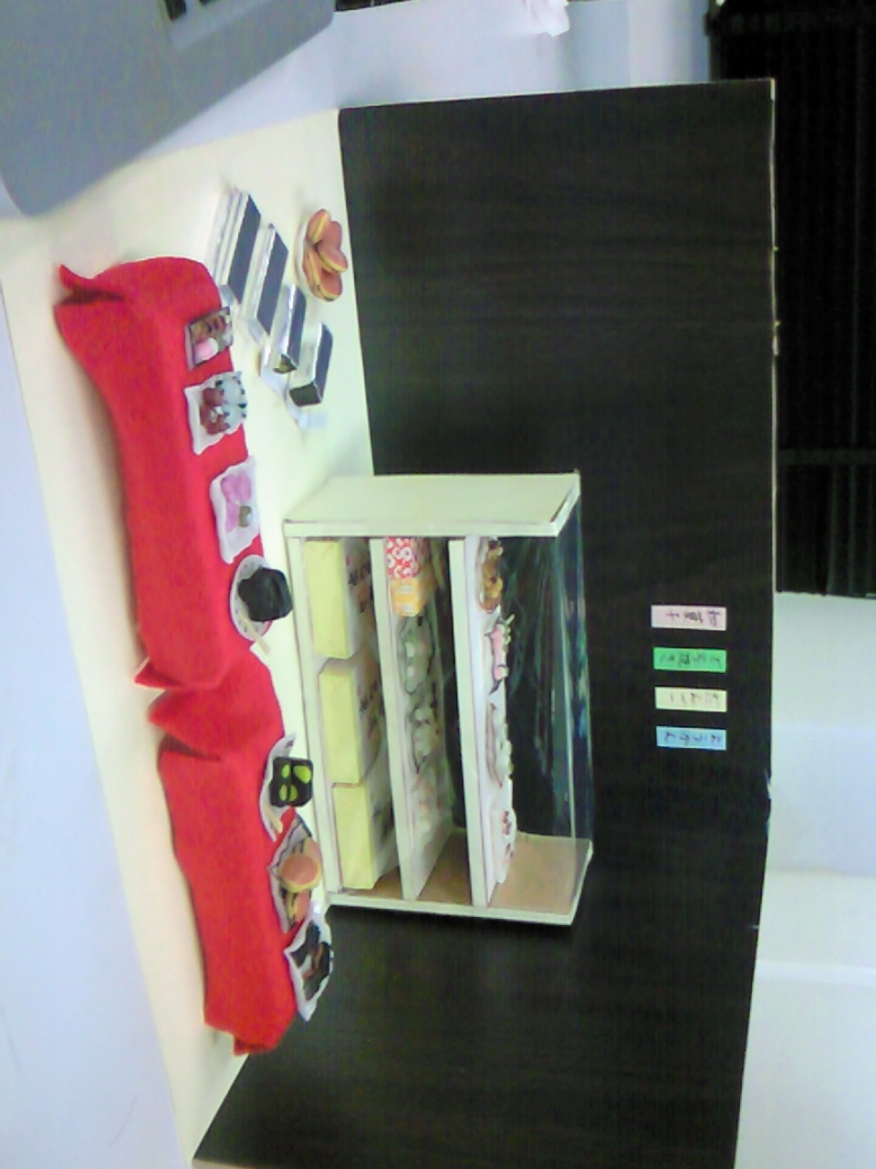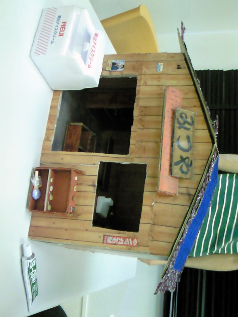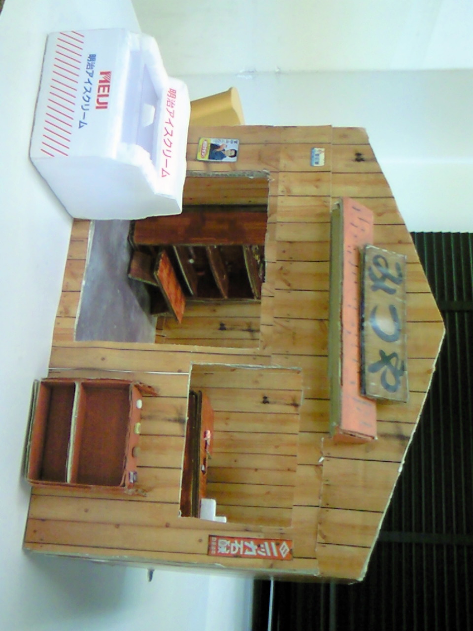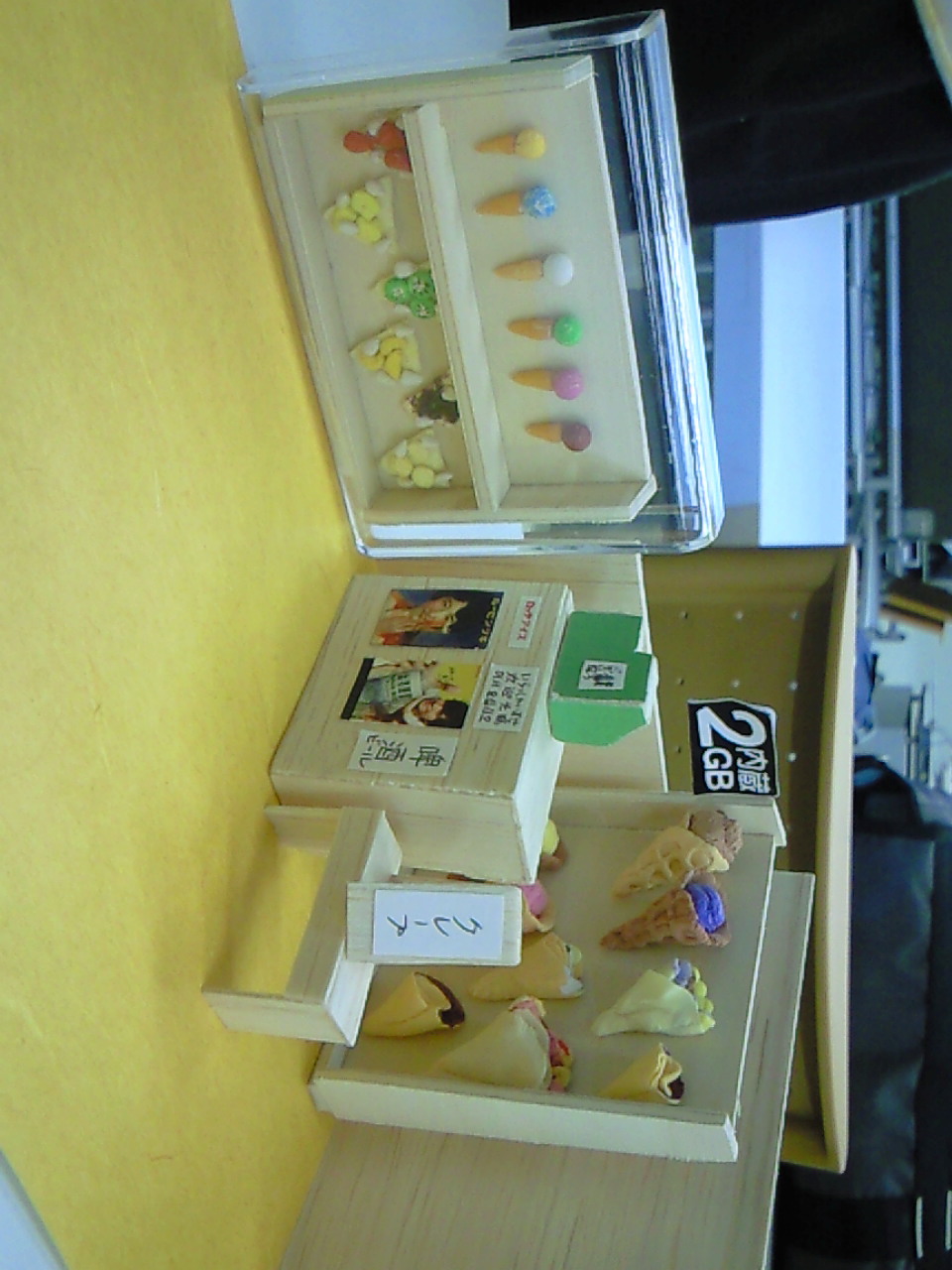 中の駄菓子とか。アイスケースと冷蔵庫と中の棚とかカウンターとか店と構成する道具的なものは俺が作った。開閉できるようにするのに苦労した。1円玉や10円玉は比較。